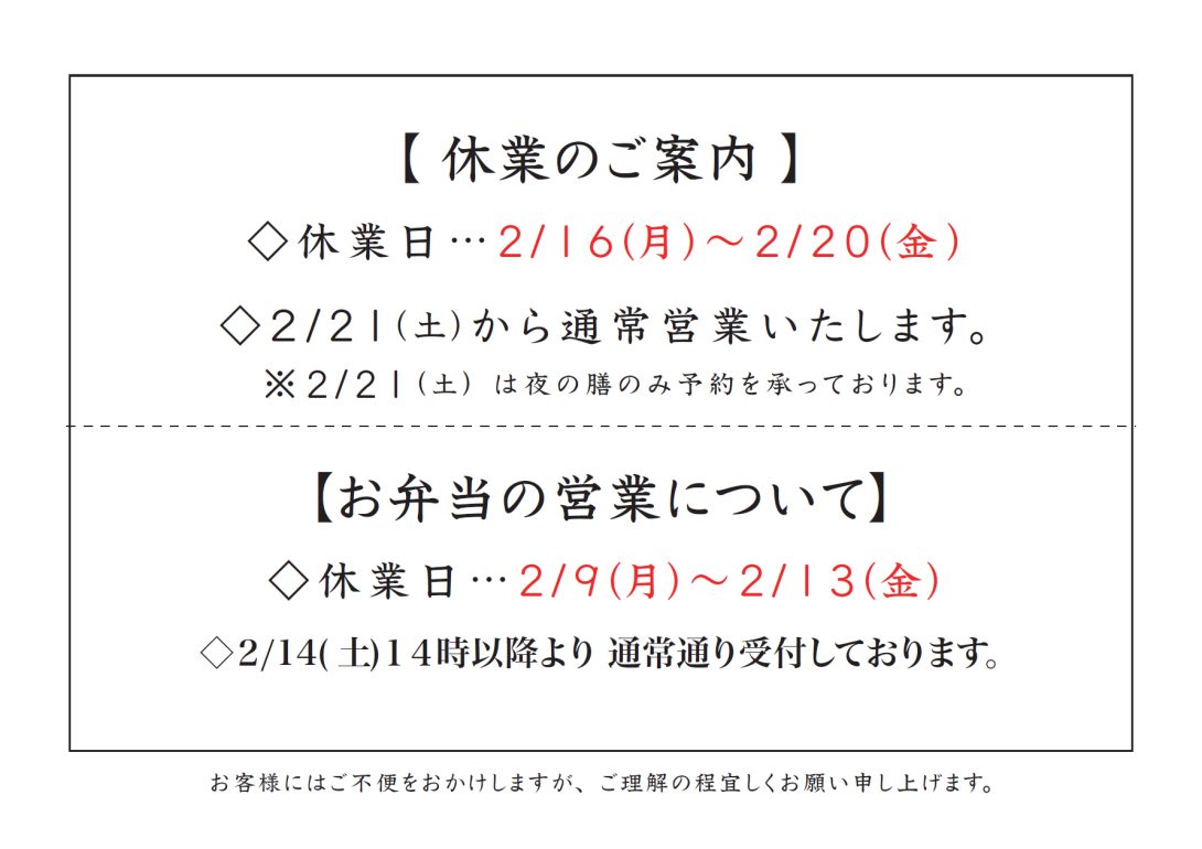 【冬期休暇】2月9日(月)~2月13日(金)